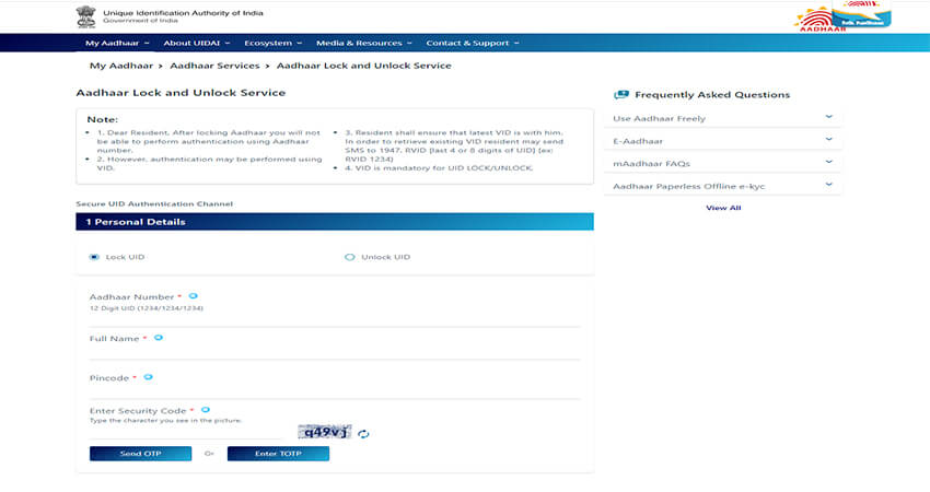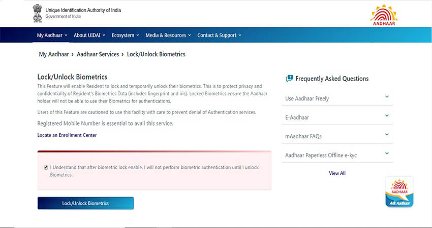 It is important to keep the Aadhaar Biometric Data protected and safe from access to an unwanted party or agency. You can restrict anyone from misusing the Aadhaar Biometric data by locking the relevant details stored on the UIDAI servers. You can any time unlock the biometric data online so that it can be utilized for verification once again.