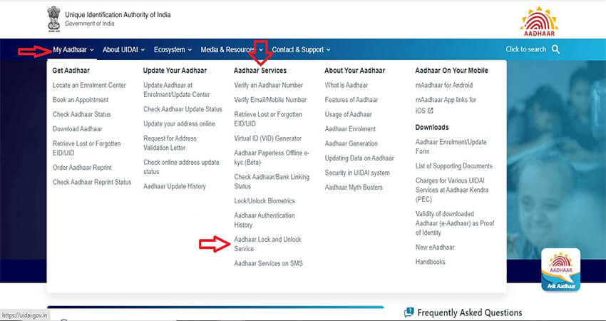 - Visit the official website of UIDAI. Under ‘My Aadhaar’, go to tab ‘Aadhaar Services’. Select ‘Lock/Unlock Biometrics’.